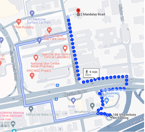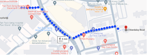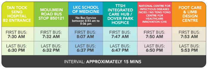 Shuttle bus services operate from the B2 entrance of Tan Tock Seng Hospital to the Lee Kong Chian School of Medicine and Moulmein Road Bus Stop (B50121) from 5.06pm to 6.37pm on weekdays.